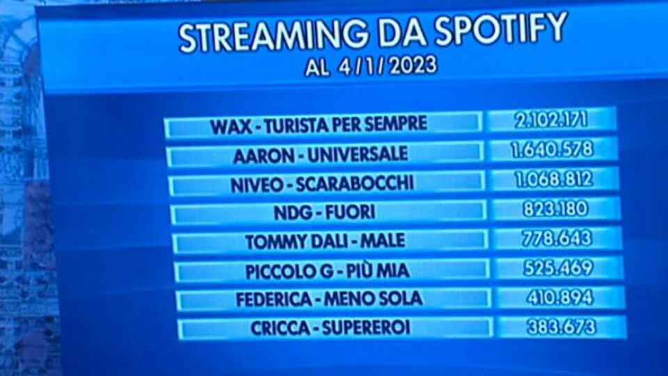 Pubblicato il . 2023-11-08Nel pomeridiano di Amici 23 di mercoledì 8 Novembre, ai cantanti vengono comunicati i dati di streaming su Spotify dei loro inediti a 20 ore dall'uscita sulla piattaforma. Ecco la classifica: Holden con "Dimmi che non è un addio" 162.000 Petit con "Che fai" 113.000 Mida con "Rosso fuoco" 97.000 Mew con.